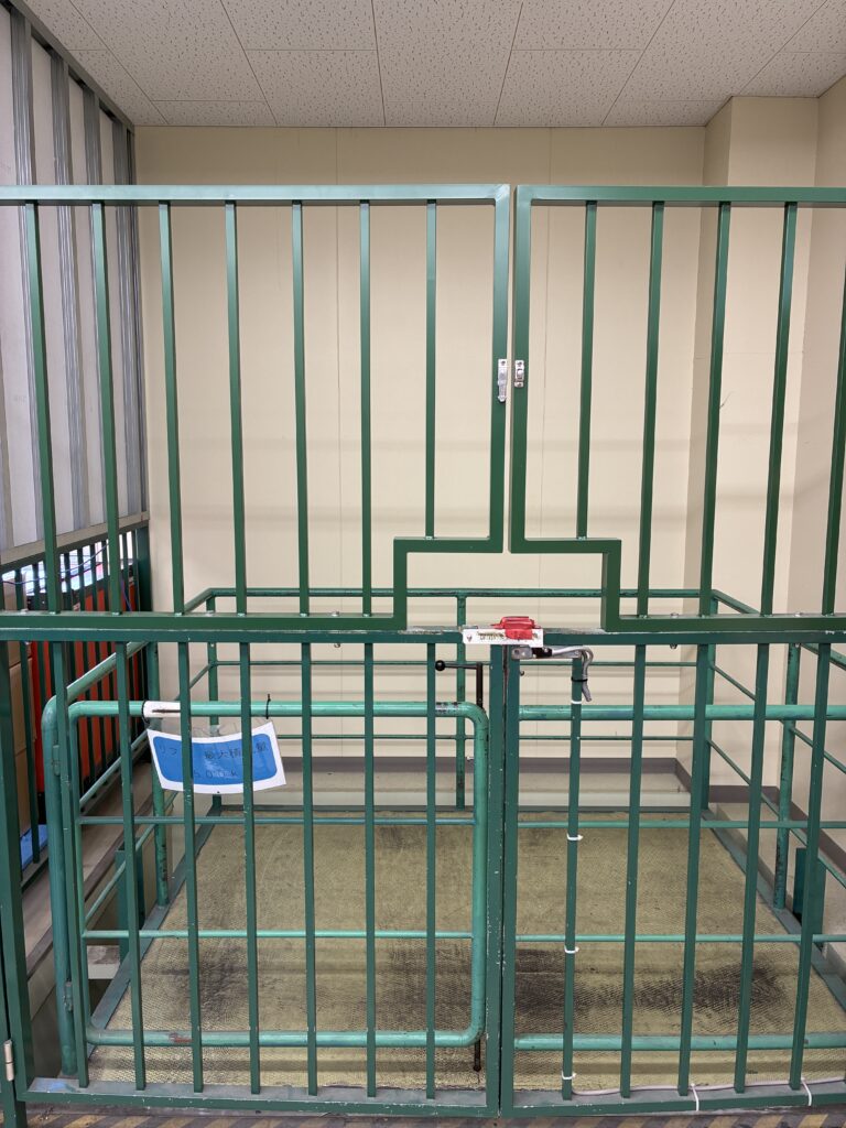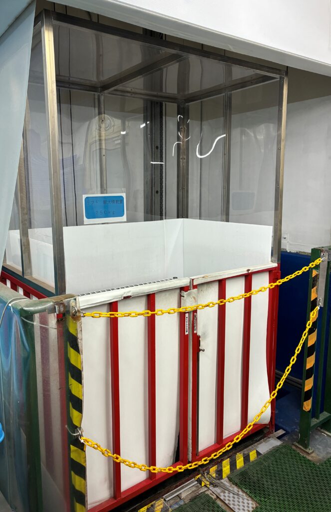 クリーンルームで最終仕上げをした半導体の製造装置の部品を乾燥オーブンで乾燥させ、パッキングし、梱包をしてこの緑のリフトで下します。