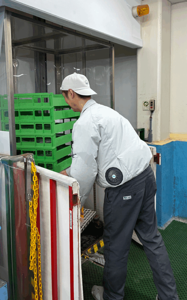 洗浄室のリフトで超音波洗浄をする製品を運ぶK社員